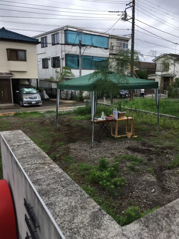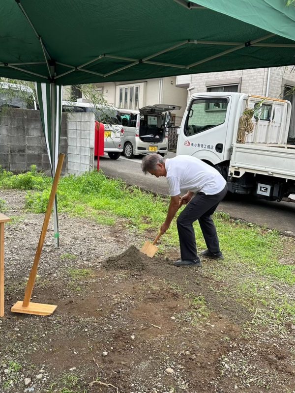 続いて、地鎮祭のひとコマ。当社社長が鋤(すき)入れをしているところです。鋤入れ、鍬(くわ)入れ、四方払いといった儀式を行い、土地の神様に建築の許しを得ます。