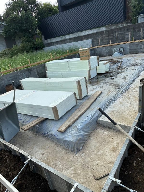 基礎工事が始まり、捨てコンクリートの打設と型枠の設置まで完了しました。この後、基礎下断熱の工事を行います(写真に写っている白い板が基礎下断熱用の断熱材です)。
