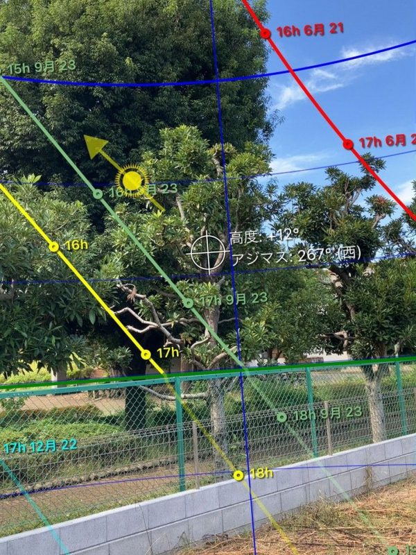 昔と違って今は便利なツールがあり、下の画面はSunSeekerというスマホアプリを使って調べたI様邸の敷地の、季節ごとの太陽の動きです。SunSeekerを起動させた状態で、調べたい方角にスマホを向けるだけで、その方角の四季それぞれの陽当たり具合が把握できます。ちなみに赤線が夏至の日、緑線が春分と秋分の日、水色の線が冬至の日、黄線がその日の太陽の動きを表しています。