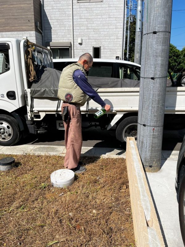 草刈り後、お清め式を行いました。下の写真は、敷地の四隅にお清めのお酒をまく古川大工です。1年以上の設計期間を経て、いよいよ家づくりが始まります!頑張るぞ!オー!