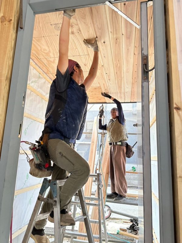 下の写真は、2人がかりで玄関の軒天に無垢の杉板を貼る職人さん。手前に写っているグレーに塗装されたスチール製のフレームは、以前ほんの少しだけ紹介した特注の玄関ドアです。
