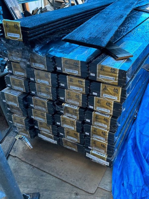 杉板貼りが終わる頃、現場に焼杉が搬入されてきました。これもK様邸の外壁材として使用します。ちなみにK様邸で使用する焼杉は、広島県の中本造林さんの焼杉です。