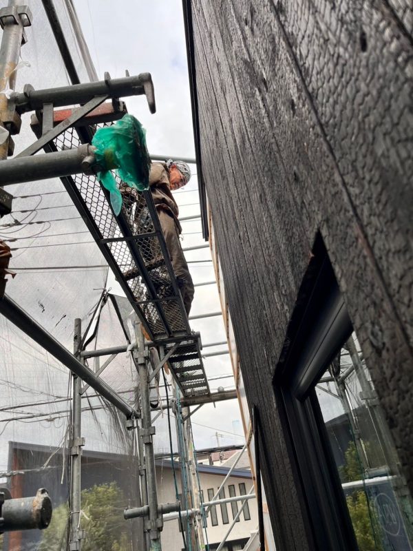 焼杉の施工が始まりました。中本造林さんの焼杉には、クリア塗装タイプなど複数の種類があるのですが、K様邸に使うのは無塗装の素焼きタイプです。手はもちろん、服も大工道具も、あっという間に煤(すす)で真っ黒になります。