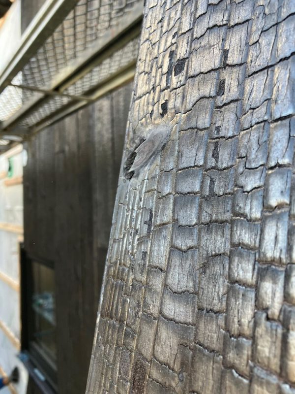 焼杉の表面をアップで撮った写真。焼かれて炭化した木材は、驚くべき耐久性を持っています。青森県に三内丸山遺跡という縄文時代の遺跡があるのですが、そこからは、縄文人によって意図的に焼かれた柱の根元部分が、原型をとどめた状態で発掘されています。もしかするとK様邸の外壁も、数千年後に発掘されて未来の日本人をビックリさせるかもしれません。