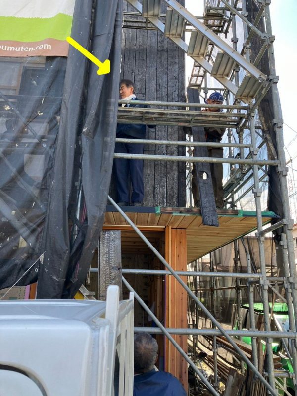 焼杉の施工の様子をチェックする当社社長(黄色い矢印)。K様邸は、普段使わない材料を使うことが多く、また難易度の高い造作も多いので、社長は毎日のように現場に来ています。