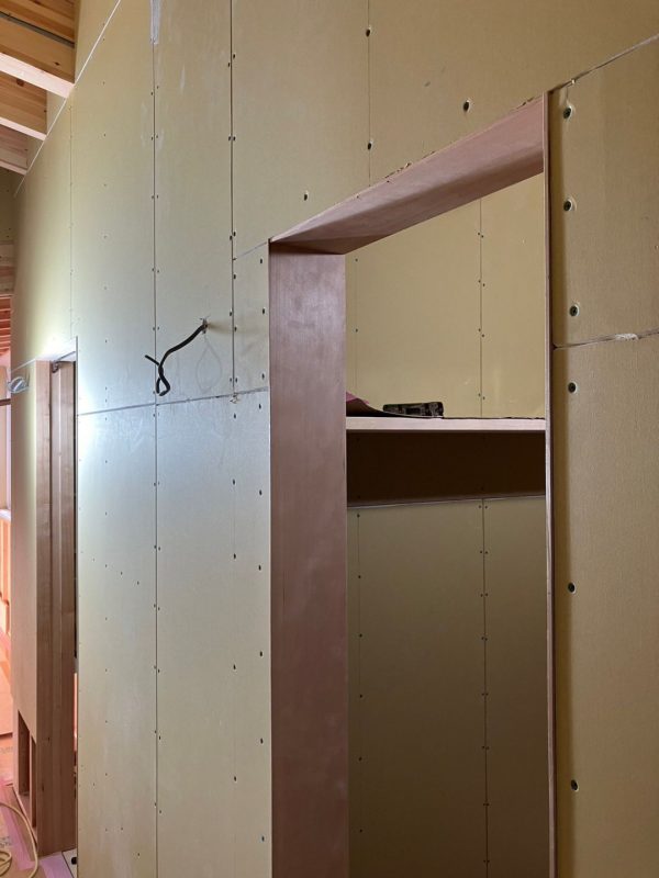 下の写真に写っているドア枠ですが、一般的なドア枠と比べて、枠の厚みが薄いと思いませんか?ご自宅のドア枠を見ていただくとわかりやすいと思うのですが、一般的なドア枠は2.5センチほどの厚みがあるのにたいして、K様邸のドア枠は、「スッキリしたデザインにしたい」というK様のご要望により、厚さ6ミリで仕上げています。