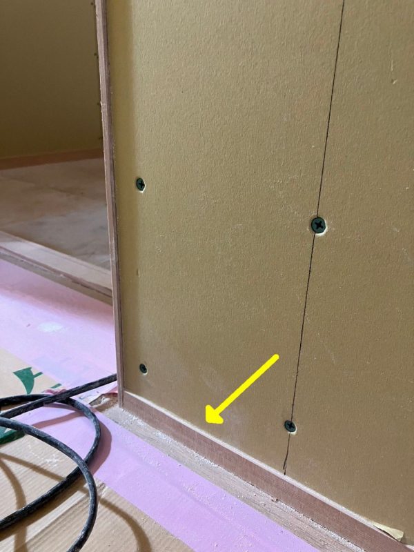 同様の工夫は巾木(黄色い矢印)にも施しています。ドア枠と同じく厚さ6ミリのスッキリしたデザインにしたいというご要望を受け、加工した巾木の本体部分を壁の中に隠すことで、こちらも実現しています。