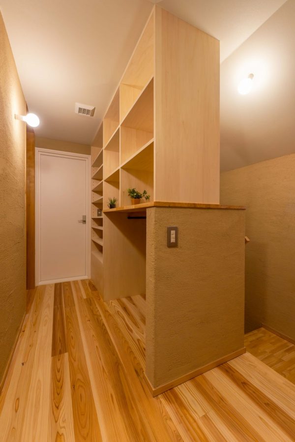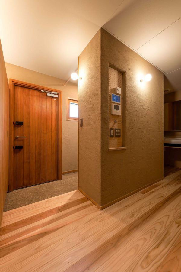 玄関ホール。S様邸の床材には、無節(むぶし/節のない)の杉の無垢材を使っています。内壁には薩摩中霧島壁という火山灰を主成分にした天然素材の塗り壁材を採用。薩摩中霧島壁には10色以上のカラーバリエーションがあり、白系の色を選ばれるお客さまが多いのですが、S様が選ばれたのは砂色。そのおかげで、どこか小さな美術館みたいな雰囲気のある空間になっています。