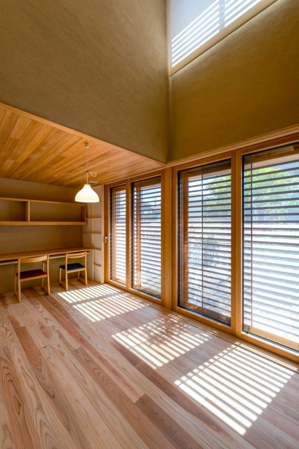 吹き抜けのあるLDK。南側の窓の外側に付けた木製横格子を通り抜けて、明るい日差しが室内に射し込んできます。横格子は、意匠的な役割も大きいのですが、パッシブハウスの日射遮蔽の要件を満たすという重要な役割も担っています。