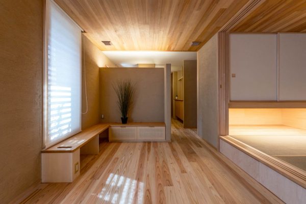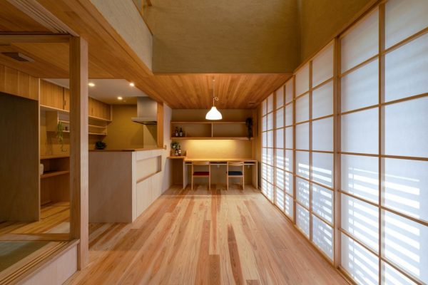 キッチン横の小上がりの和室。左側の壁から3枚の吉村障子を、キッチン側の壁からシナ合板の引き戸をするすると引き出すことで、間仕切れるようになっています。