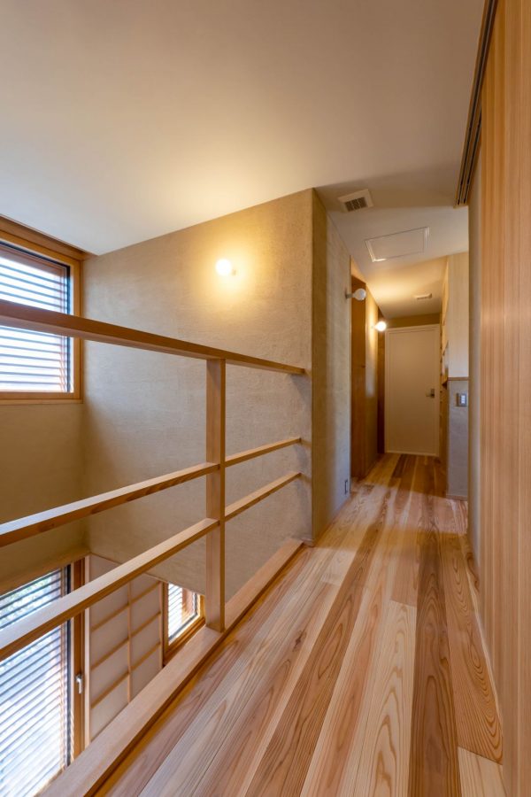 2階吹き抜けスペース。木製の手すりは、すっきり見えるように、左右の塗り壁から突き出るような意匠デザインにしています。