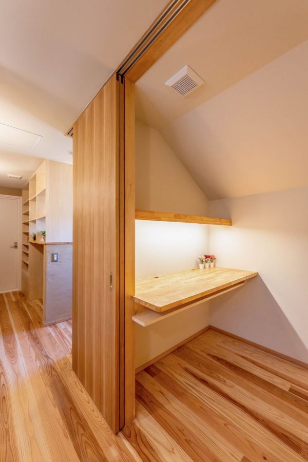 上の写真の右側にあるご主人の書斎。テーブル板の下に棚板を入れて、間に書類などを収納できるようにしています。テーブルの真上にある四角いカバーは、全館冷暖房システムの吹き出し口です。