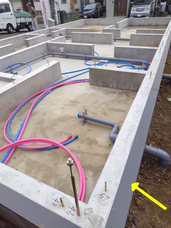 前回のレポートから1か月が経ち、無事に基礎が完成しました。黄色い矢印で示している黒い板状のものは、断熱材を保護するための「蟻返し板金(※)」です。この板金の下には基礎と一体化した分厚い断熱材があり、地面や地表からの冷気の侵入を遮断するとともに、建物からの熱損失をしっかり抑えてくれます。
