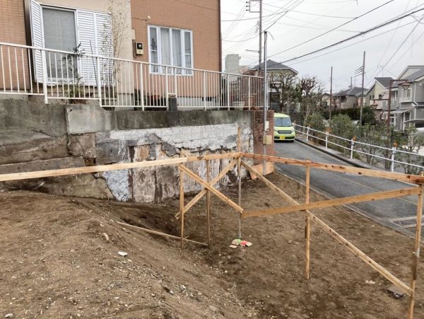 下の写真を見ていただくとわかるように、高低差のある土地なので、基礎工事が少々(というか、かなり)大変です。