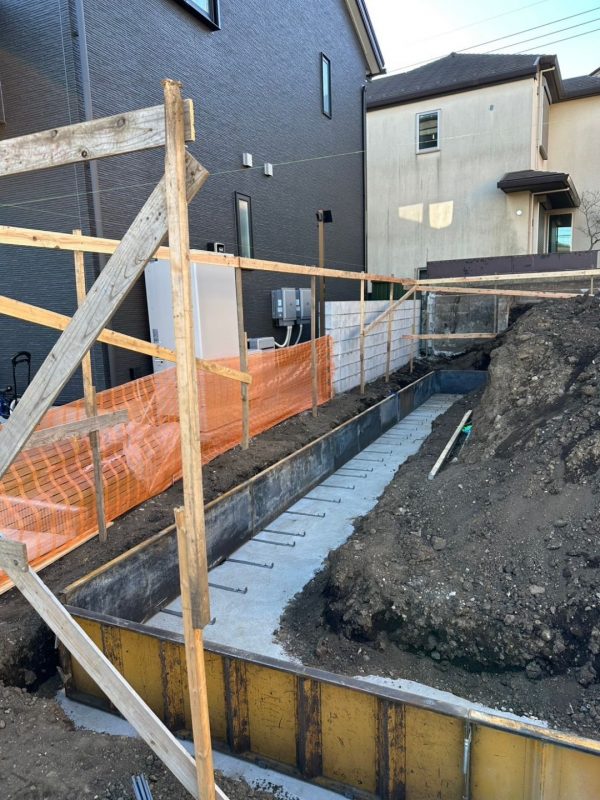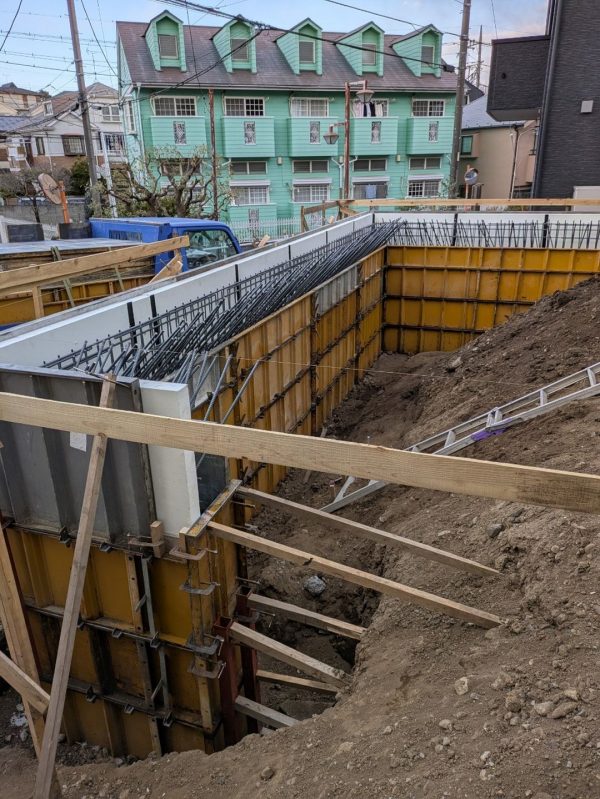 反対側から見た様子です。すでに基礎の配筋工事も始まっています。白いボードは基礎断熱用の断熱材です。