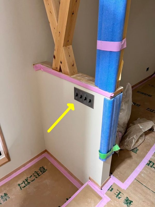 先月のブログで紹介した、“見せる筋交い”も完成しています。黄色矢印は、レトロでクラシックなデザインが人気のアメリカンスイッチ。100年以上の歴史を持つ、アメリカ発祥のスイッチです。
