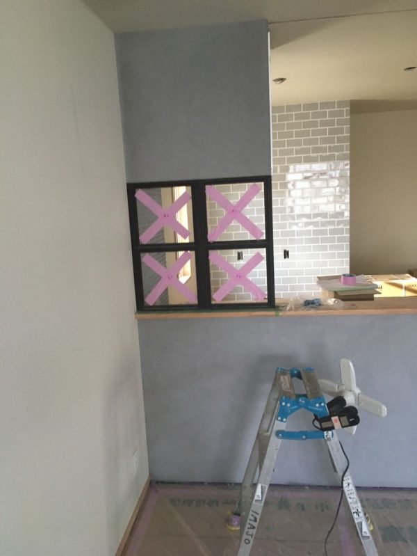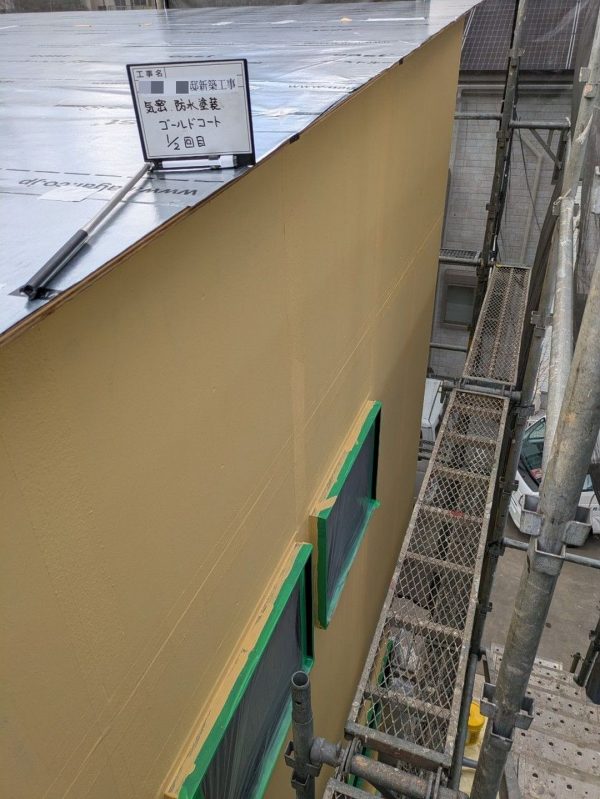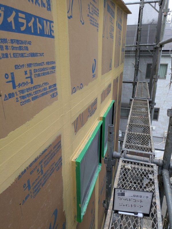耐震ボードの継ぎ目とサッシまわりの気密施工が終わりました。ジョイントテープごと、ゴールドコートをたっぷり厚めに塗り込んでいます。
