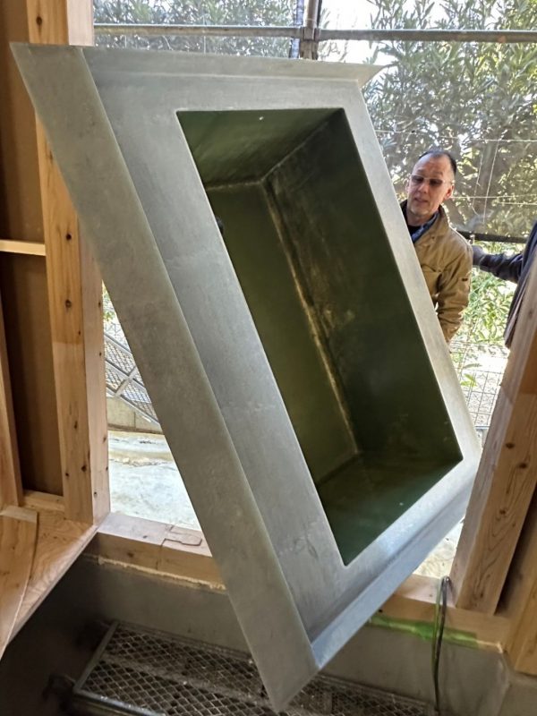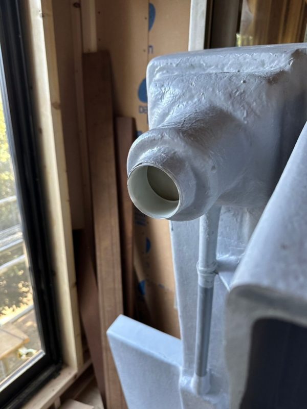 ちなみに写真に写っている怪しげな男性は(笑)、この防水パンを製作してくださったFRP成型会社の社長さんです。据え付けにあたり、わざわざ来てくださいました。