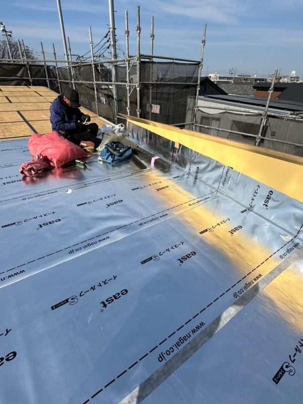 下の写真の銀色のシートがイーストルーフシルバーです。照り返しがすごくて、見ていると目がチカチカしてきます。職人さんも、まるで春スキー帰りのような日焼けをしながら、頑張って貼ってくれました。