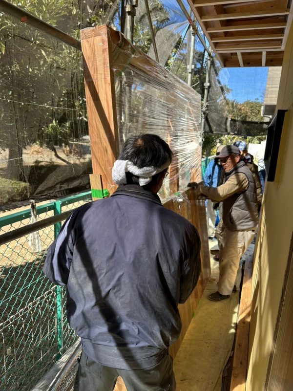 続いて、家全体の外側にゴールドコートを塗っていきます。ホワイトボードに「1/2回目」と書いてありますが、ゴールドコートは二度塗りを行います。