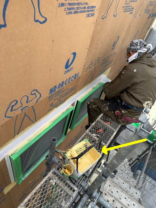 まずは気密施工から。下の写真は、隙間ができやすいサッシまわりに、ジョイントテープごと気密塗料のゴールドコートを塗っているところ。矢印の黄色い液体がゴールドコートです。乾くとゴムのようになって、強力な防水性能と気密性能を発揮します。