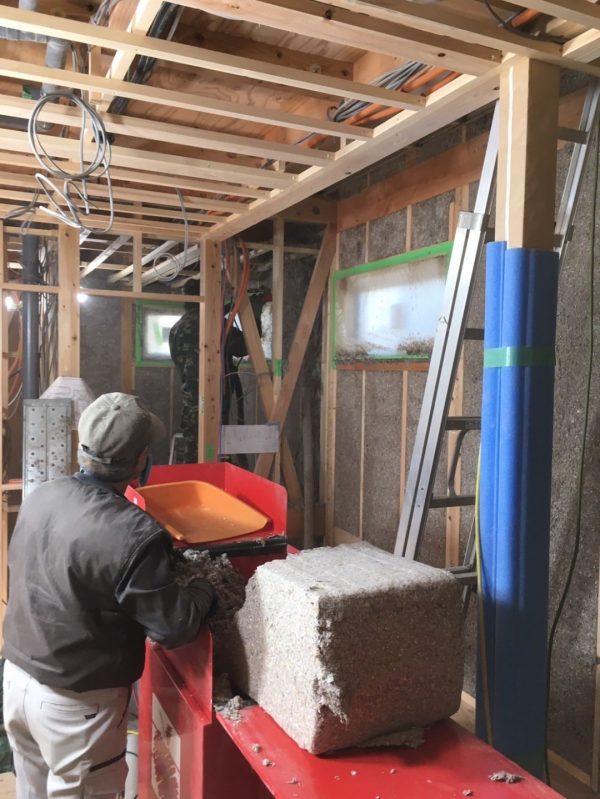 下の写真の赤い機械は、断熱材のセルロースファイバーを吹き付けるための「ブロワー」です。手前の人がセルロースファイバーのかたまりをほぐしながら機械に投入し、もう一人(写真奥)がノズルの先から勢いよく排出されるセルロースファイバーを壁の中に吹き付けていきます。