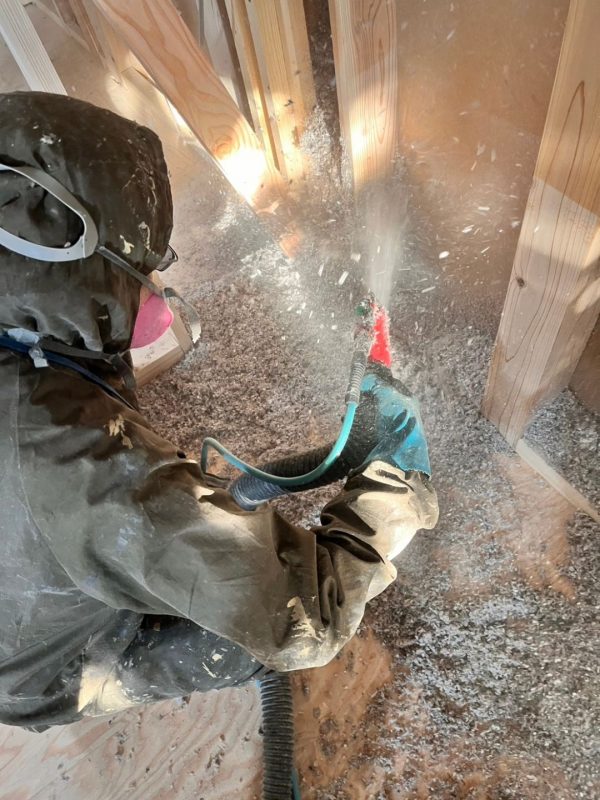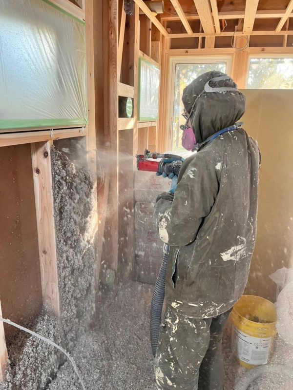 セルロースファイバーには、トウモロコシ由来の天然の糊成分があらかじめ混ぜてあり、霧状の水といっしょに吹き付けることで壁内に固着します(ウォールスプレー工法といいます)。といっても、混ぜてある糊の量はごくわずかなので、吹き付けたセルロースファイバーのうち半分ほどは固着せずにパラパラと落ちてしまいます。床に落ちた分はかき集めて再利用します。