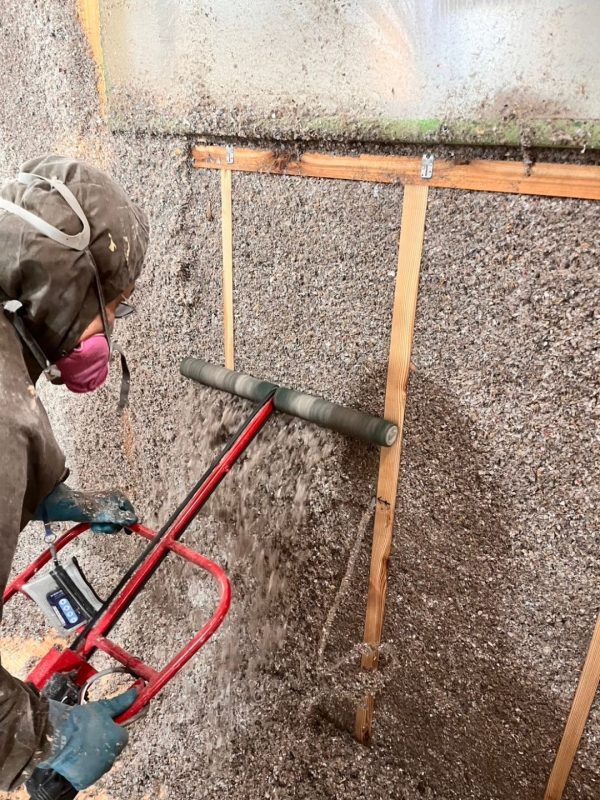 壁の厚みからはみ出したセルロースファイバーは、専用の電動ローラーで削ぎ落としていきます。ちなみに、セルロースファイバーを使った断熱工事は、専業の業者に外注する建築会社も多いですが、小野寺工務店では自社で施工しています。