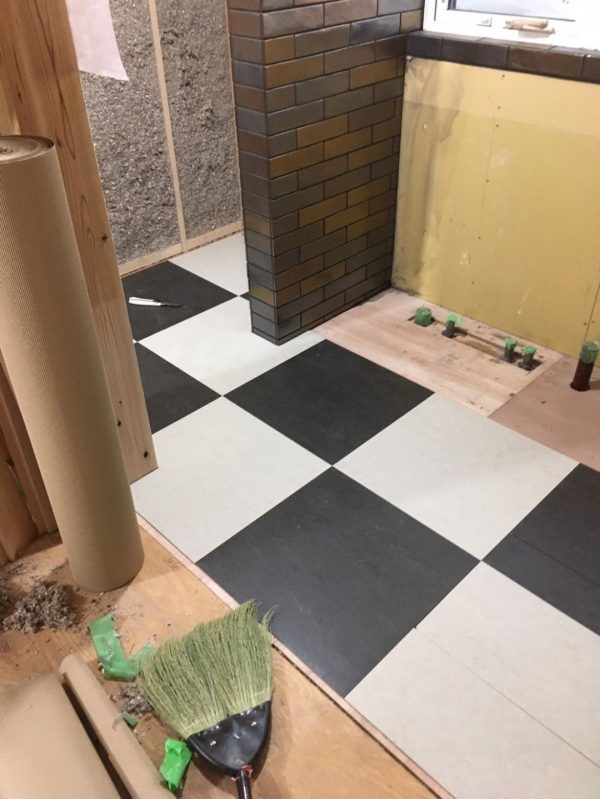 キッチンの床材はリノリウムです。化学建材と誤解されがちなリノリウムですが、実際は亜麻仁油、石灰岩、木粉などの天然素材を組み合わせて作られた、環境負荷の低い自然素材です。