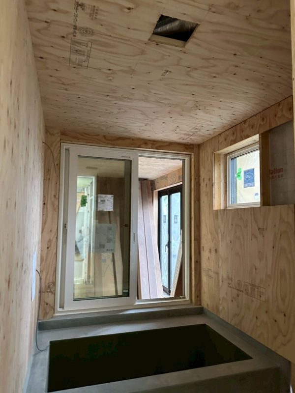 続いて、屋内の造作工事の様子をご紹介します。I様邸では、水回りに特徴的な造作がたくさんあるので、そのあたりを中心にレポートしていきます。