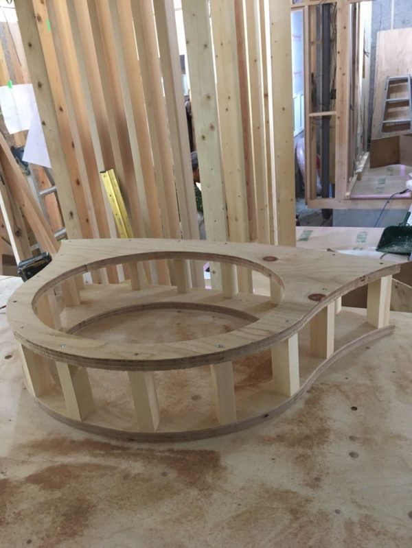 答えは、洗面台を設置するための台座です。複雑な形状のため、同じサイズの型紙をまず作り、それをもとに木材をカットして組み上げています。最終的にどんな洗面台ができあがるのか?乞うご期待ください。