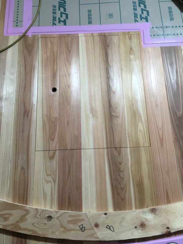 こちらは洗面室に設けた床下点検口。「できるだけ目立たないようにしたい」というご要望を受け、既製品は使わず、床材(無垢の杉板)に合わせて造作しました。