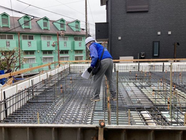 基礎の配筋工事が終わり、第三者機関(JIO)による配筋検査を行いました。ピッチ幅(鉄筋同士の間隔)や、かぶり厚さ(基礎ができあがった時の、コンクリート表面から鉄筋までの距離)などを丁寧にチェックしてもらいます。