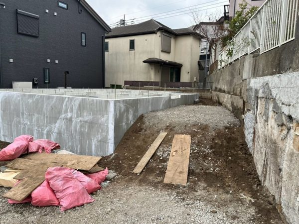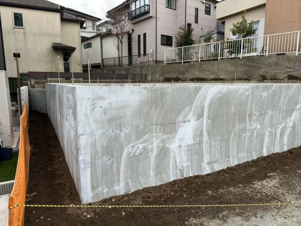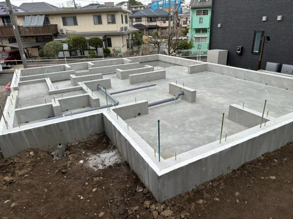 その後、コンクリート打設などの工程も順調に進み、基礎が完成しました。こちら側から撮ると普通の平らな基礎に見えますが…