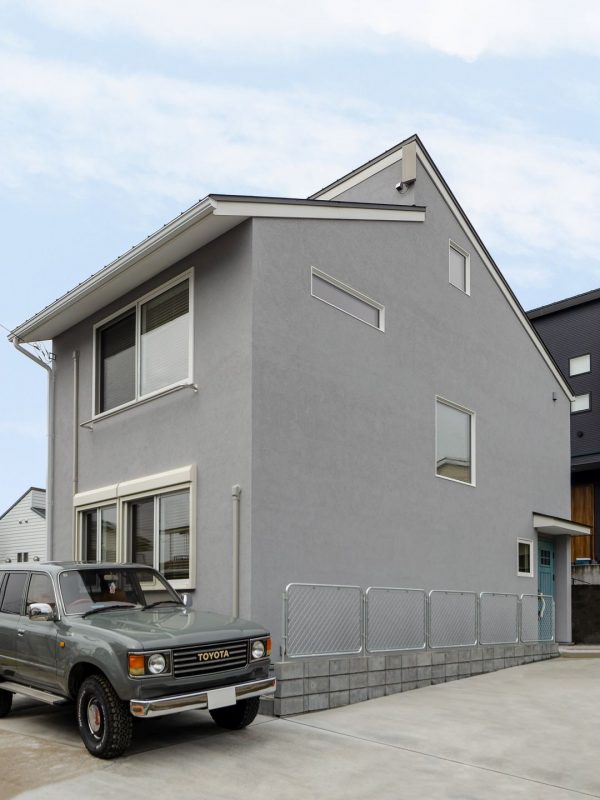 まずは、外観写真から。グレーの塗り壁で仕上げた、すっきりとした印象の外観です。最近はベランダを設けない家が増えていますが、Y様邸にもベランダはありません。洗濯物はガス衣類乾燥機「乾太くん」と室内干しで乾かすスタイルです。布団だけは室内干しというわけにいかないため、2階の窓枠の下に布団干しバーを取り付けています。