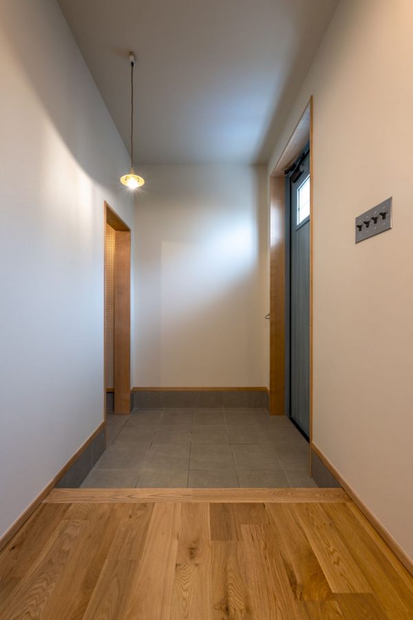 こちらは、別の角度から撮影した玄関です。シューズクロークの壁にはOSB合板を採用しています。廊下の右側には異なる色合いの扉が並んでいます。手前が洗面脱衣室、奥がファミリークローゼットの扉で、いずれも無垢材で製作された引き戸です。