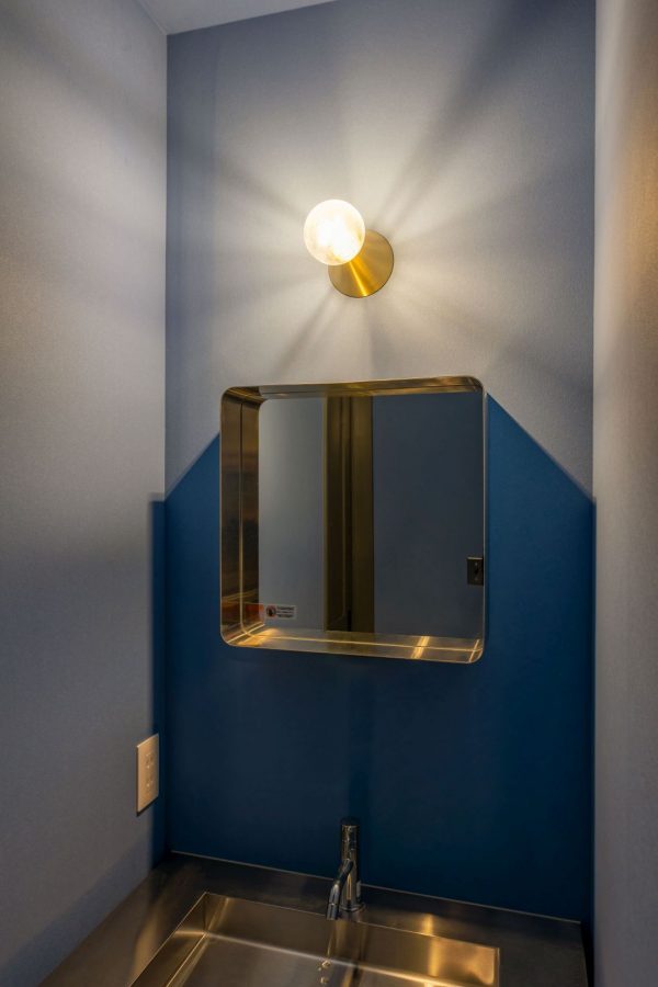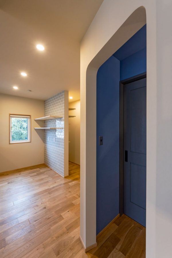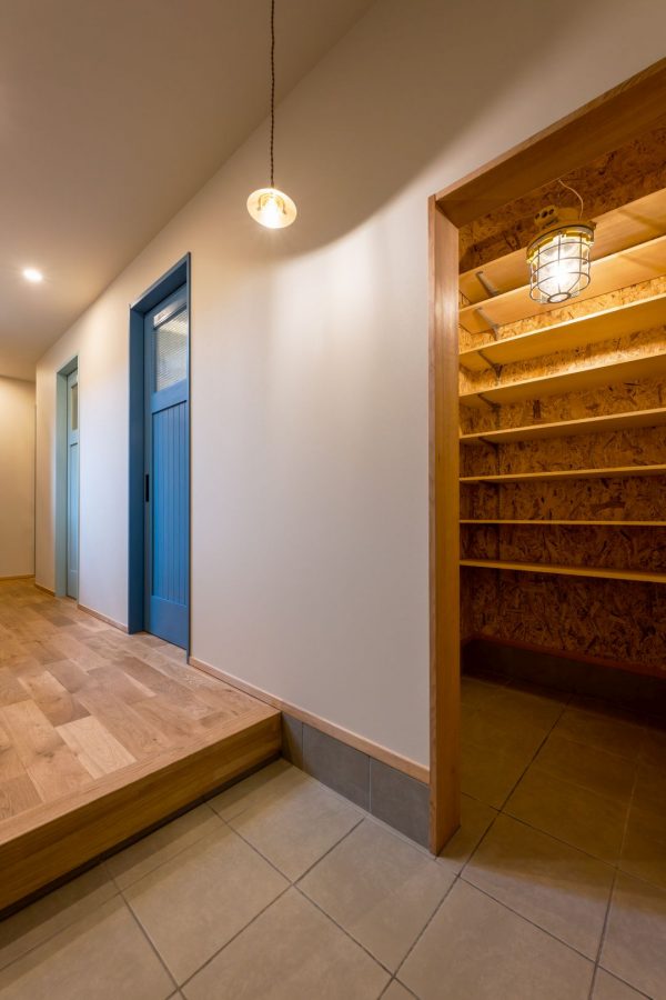 続いて玄関ホール。スモーキーブルーとでもいうのでしょうか?どこか懐かしい色合いの玄関ドアと、レトロなデザインの照明器具の組み合わせが落ち着いた印象です。壁に取り付けたスイッチは、これまたレトロな雰囲気のアメリカンスイッチです。