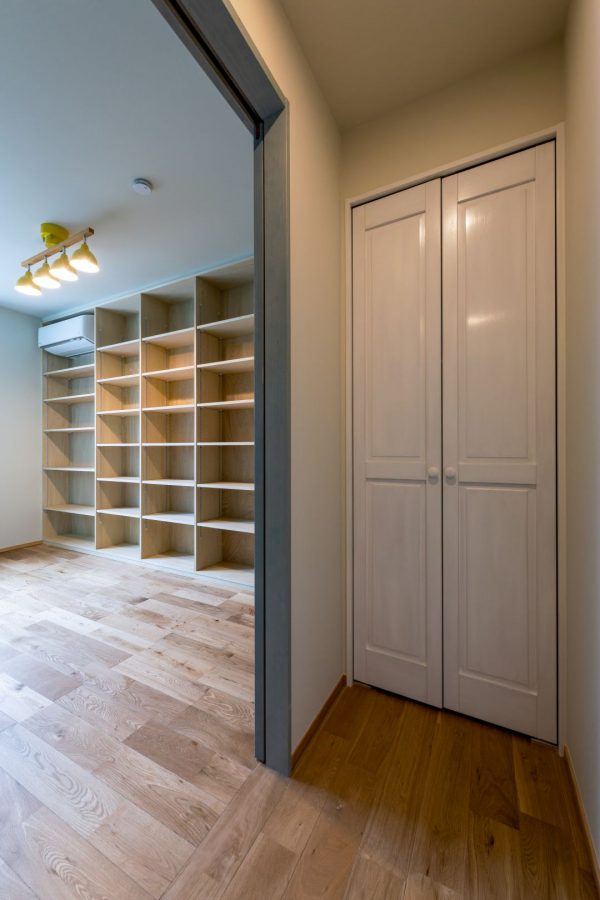 廊下を進んだ先には、奥様の趣味のお部屋があります。壁一面に造り付けの収納棚(本棚)を設置。手前の白い扉は収納スペースになっています。