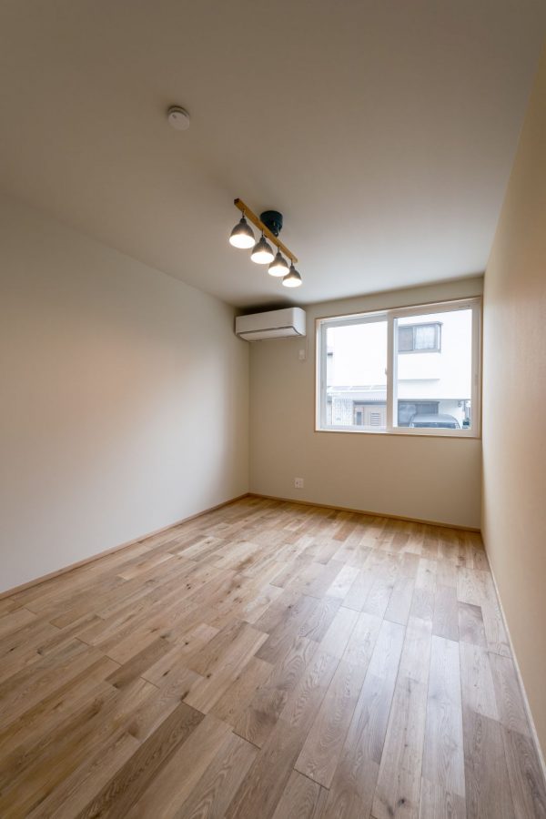 1階の主寝室です。少し分かりにくいですが、写真右側の壁にはイエローの壁紙を貼り、アクセントウォールとしています。床材はこの部屋に限らず、家全体でオークの無垢材を使用しています。