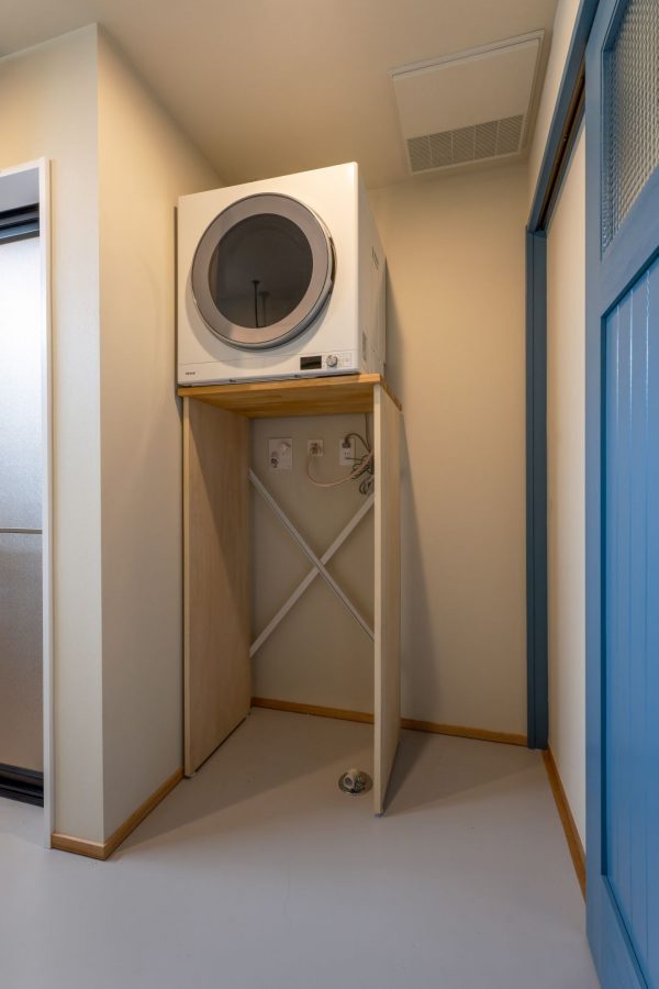 玄関の方に戻り、ガス衣類乾燥機「乾太くん」のある洗面脱衣室。乾太くんを置く台は、もともとスチール製の既製品でしたが、「少し味気ないかも」とY様よりご相談いただき、造作で製作しました。背面の筋交い部分のみ既製品の部品を流用しています。