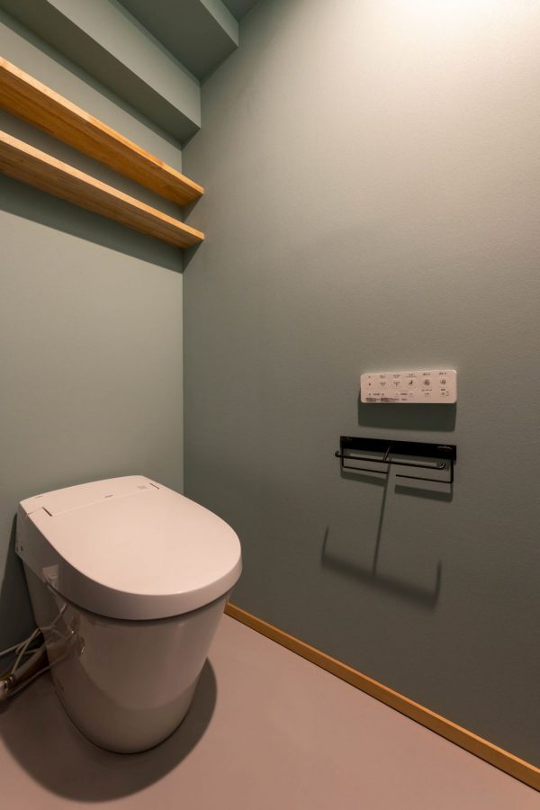 壁の色がおしゃれな1階、階段下のトイレ。収納扉を付けずにオープンな棚を設置しました。