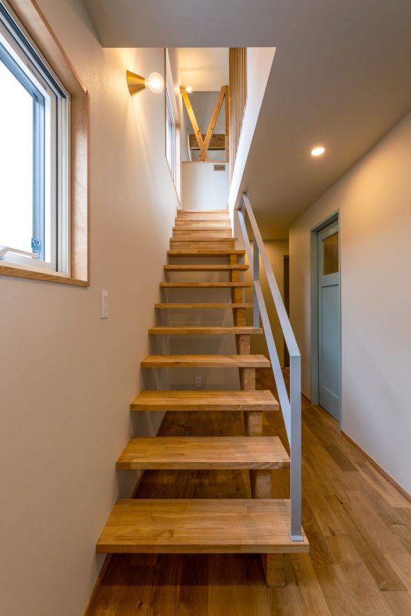 では階段を上って2階へ。階段を上がりきった正面の壁は耐力壁で、耐震構造上、筋交いが必要なのですが、「筋交いあらわし」にして圧迫感をなくしています。