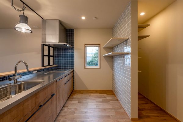 キッチンの後ろにはパントリーを設置。コンロ側の壁に貼った紺色の小さなタイルなど、細部にまでこだわったおしゃれなキッチンに仕上がったと思います。