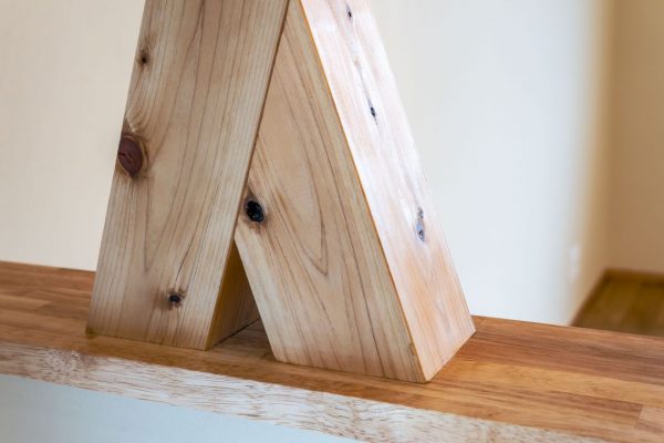 最後に、先ほど紹介した「筋交いあらわし」の笠木(かさぎ)部分をアップで撮った写真を載せておきます。先々月の月刊小野寺工務店に書いたように、筋交いが笠木から突き出ているように見ますが、実際には、一枚の板を筋交いの形状にあわせて凸凹にカットし、両サイドから挟むように組み合わせて、接合部分を目立たないように消しています。当社が得意な(そして好きな)造作のひとつです。