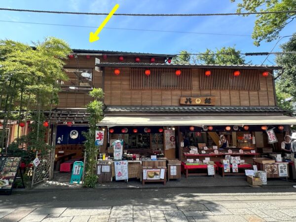 まずは正面からの写真です。手前側は6年前に大改修工事をしたところで、今回工事をしたのは後ろ側(黄色の矢印部分)。竹が元気に伸びていて、建物の様子が少し見えにくいですね。