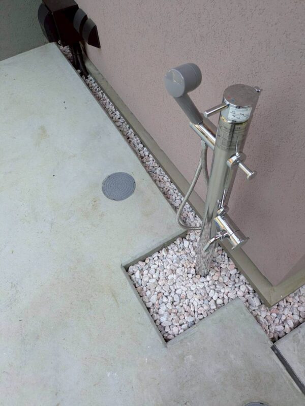 下の写真は、I 様邸のお庭に設置したシャワー付きの外水栓です。「排水用のパンがない?そのまま地面に流すの?」と思われた方、ご安心ください。ピンクの玉砂利の下に、きちんと排水溝と排水パネルを施工しています。外構をすっきり見せるためのひと工夫です。