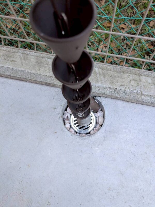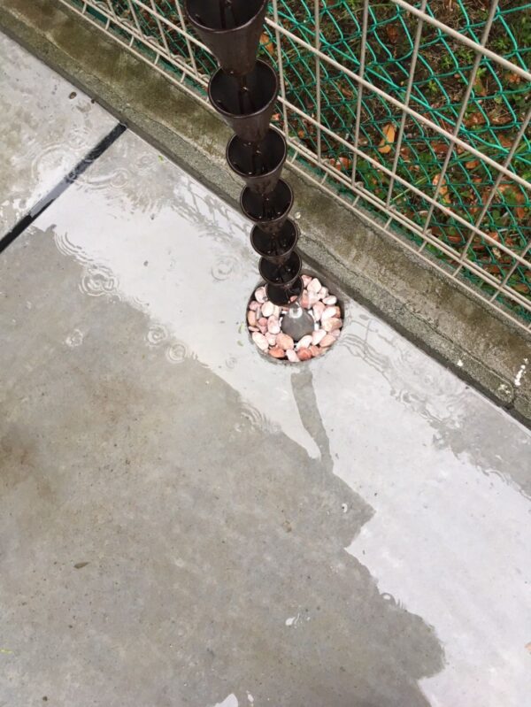 鎖樋(くさりとい)の下も同じように、玉砂利で排水溝を隠しています。