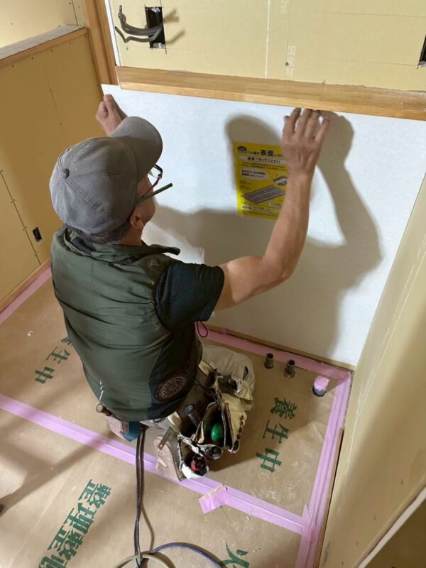 下の写真は、O様からのご依頼で、2階の洗面スペースの背面に汚れ防止のキッチンパネルを貼る鈴川大工です。今回は、彼が施工したO様邸のおもしろい仕掛けを3つ紹介します。