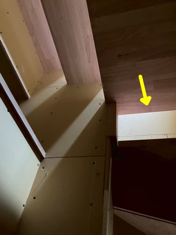 階段の下にもぐり込んで撮った写真です。黄色矢印が、上の写真の開口部です。そこから上2段分の蹴込み板を省いています。