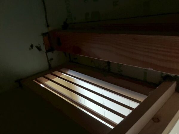 小屋裏から見た木製のルーバー。こういうのをたくさん作って、取り付けています。
